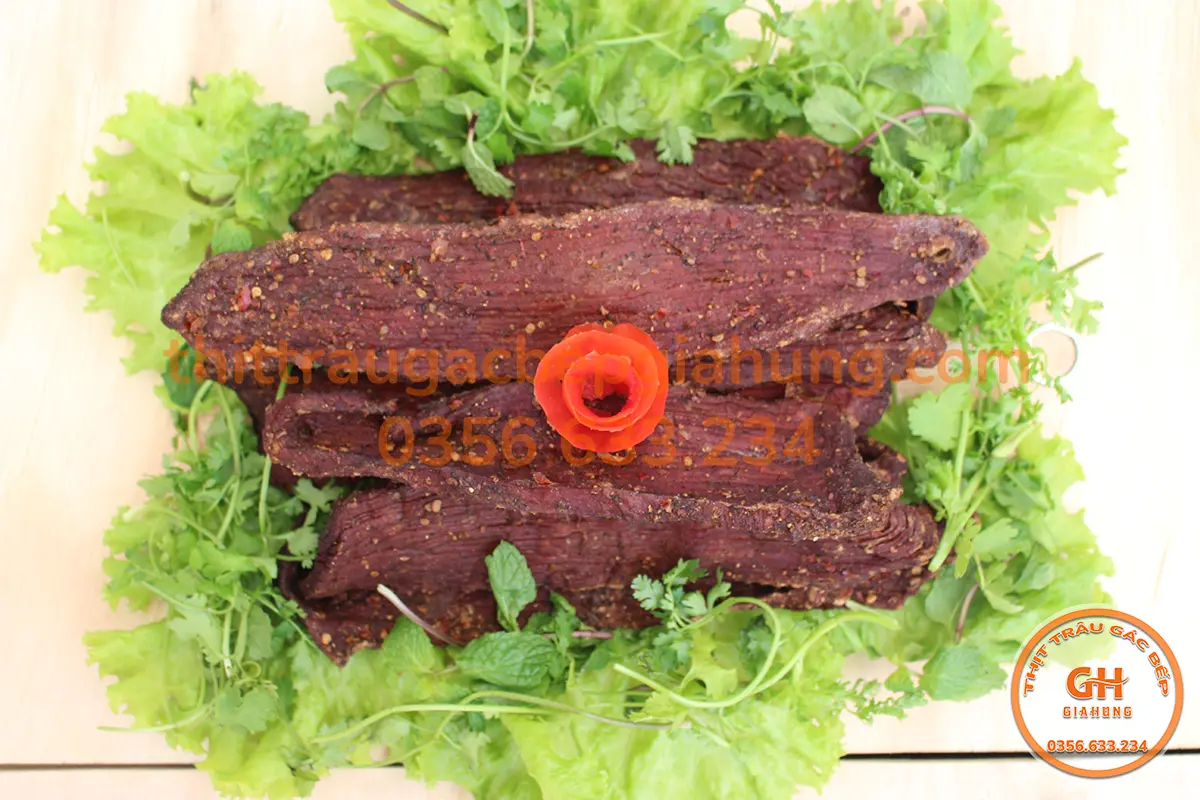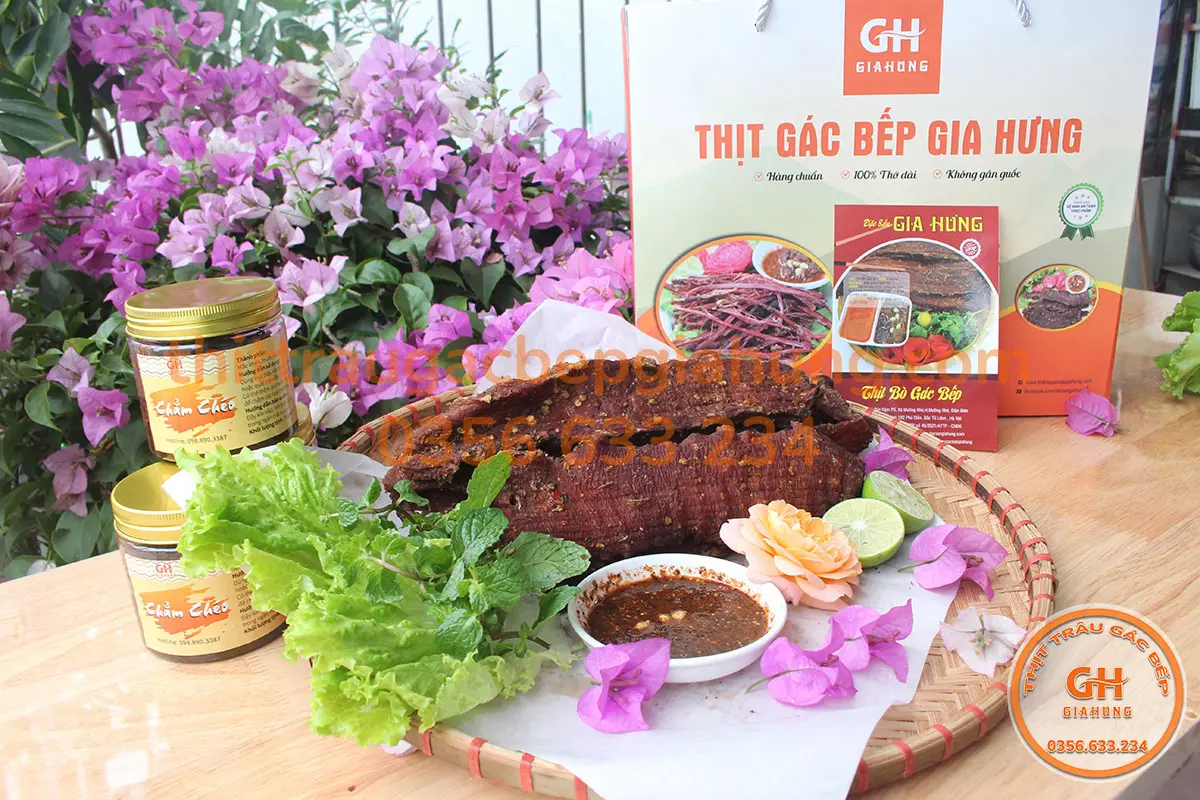 Thịt bò gác bếp Gia Hưng được làm từ nguyên liệu thịt bò chăn thả hoàn toàn tự nhiên. Được làm sạch sau đó ướp với các gia vị truyền thống như: bột canh, ớt, gừng xả và đặc biệt là không thể thiếu được vị cay nồng của tiêu rừng (hạt mắc khén). Thịt sau khi ướp sẽ được trộn kỹ cho ngấm gia vị và dùng que tre xiên vào, treo trên giàn than củi nóng hong cho chín và khô dần.